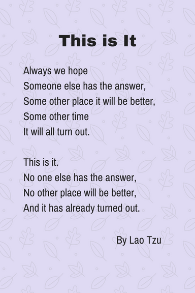 Whenever I struggle with staying in the moment, I reread this short, insightful poem by Chinese philosopher Lao Tzu.
